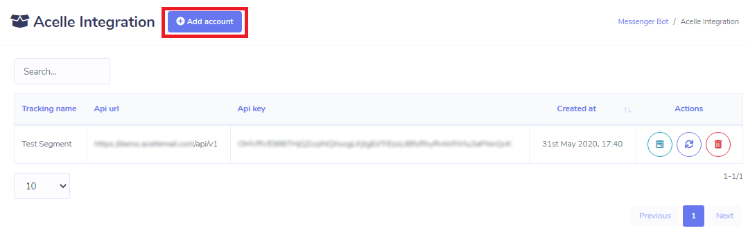 Click the Add Account button. A popup window will appear to put Tracking Name, API URL and API Key. Please provide your Acelle account’s API URL ( example: https://example.com/api/v1 ), API key and also give a name so that you can recognize it later.