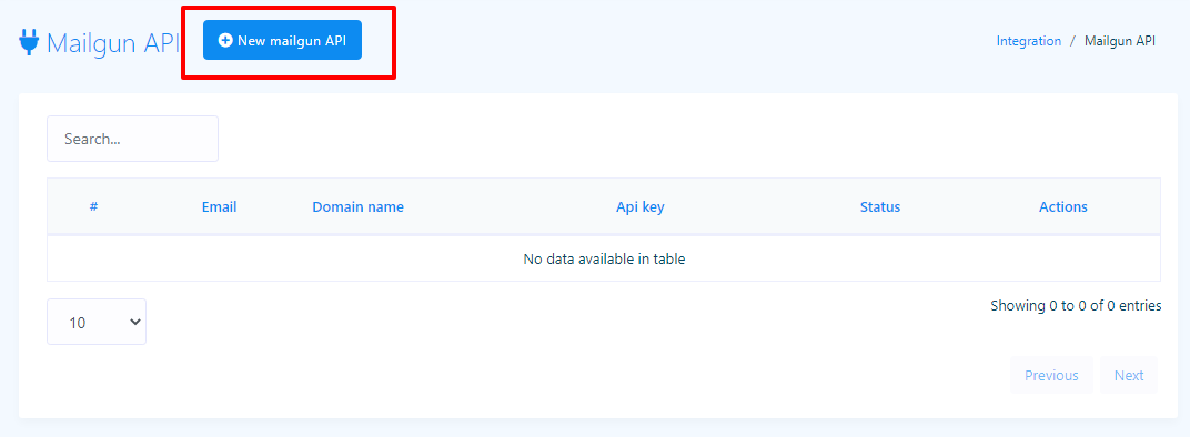 Click on New Mailgun API and a modal will appear to add sendgrid api. Fill up the form with necessary information and hit Save button.