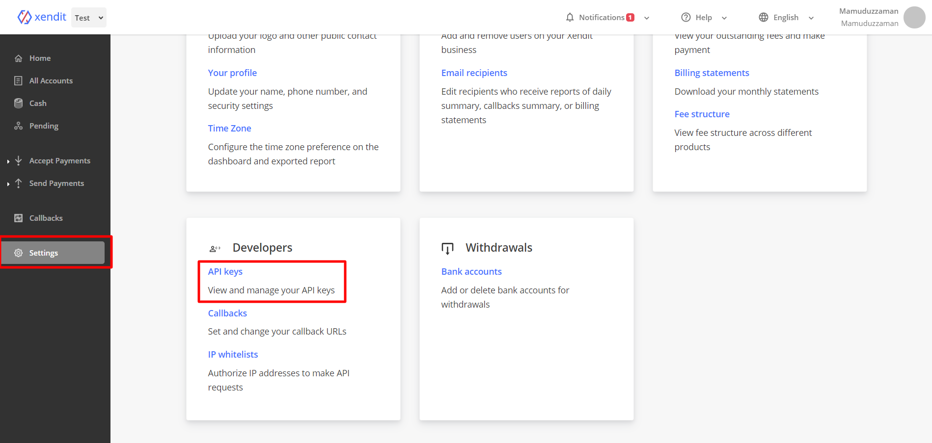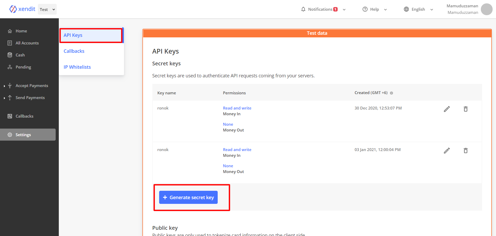 Xendit secret api key: If you want to integrate Xendit payment method then you’ve to put your Xendit secret api key. Visit Xendit and go to Settings -> Developer (API Key) and then click on Generate secret key and then copy Publick follow the instruction and put the API key into the corresponding field.
