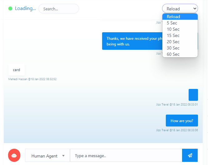 Also, you can select a time for automatic reloading by clicking on the reload button. Click on the reload button, and a dropdown menu of different times will appear. Now just select a time. After that, the live chat will reload automatically between the time you have selected.